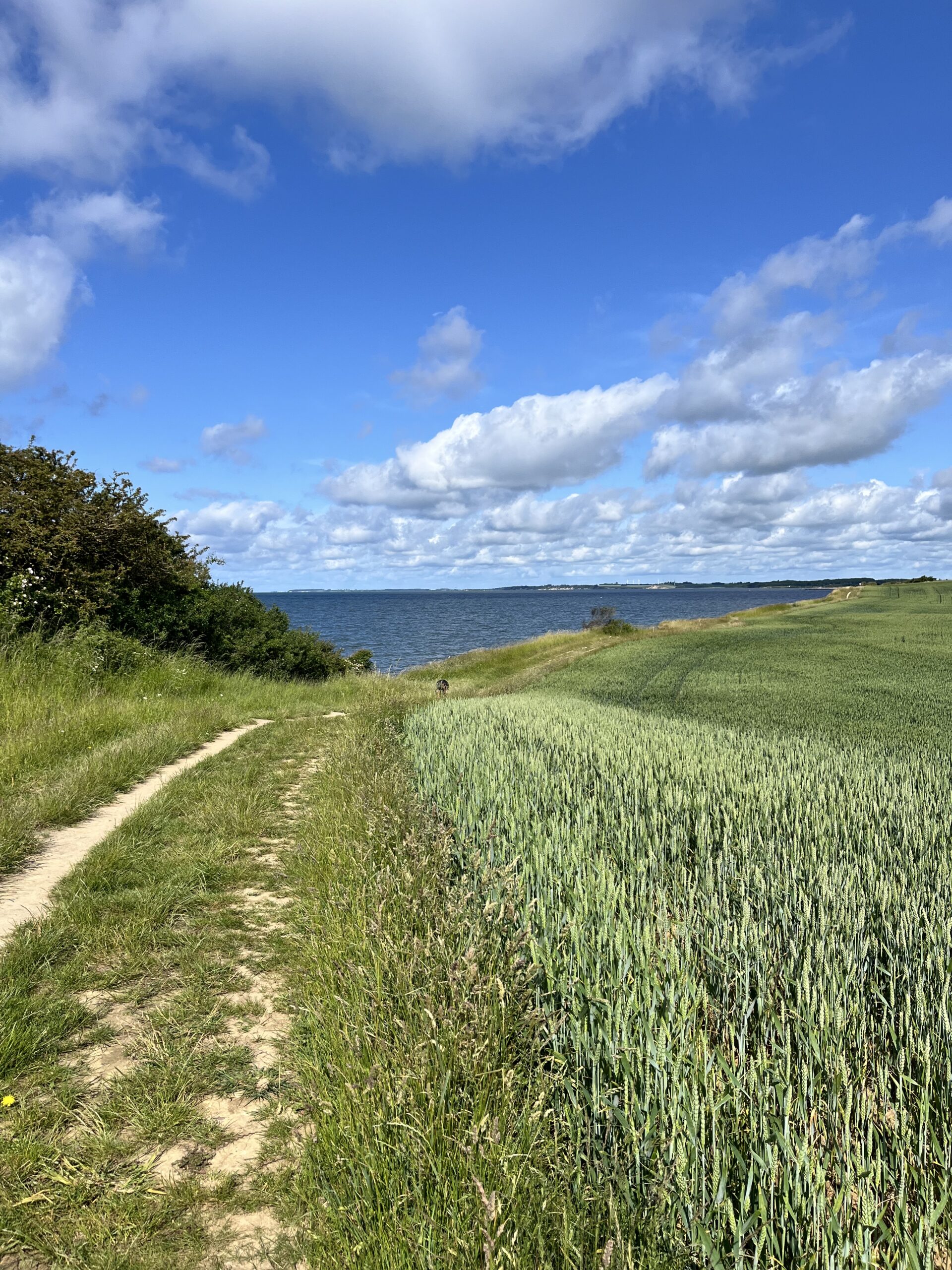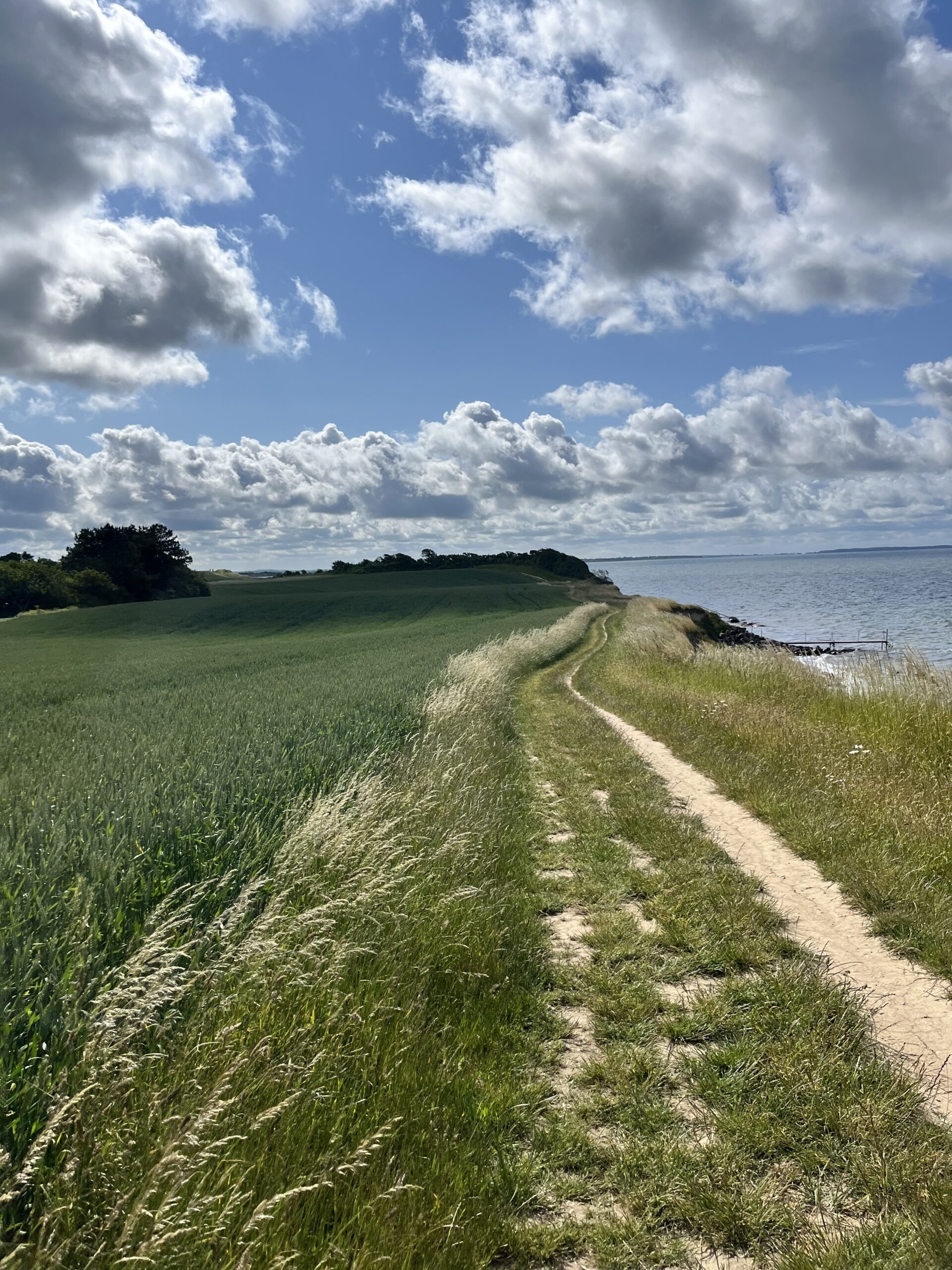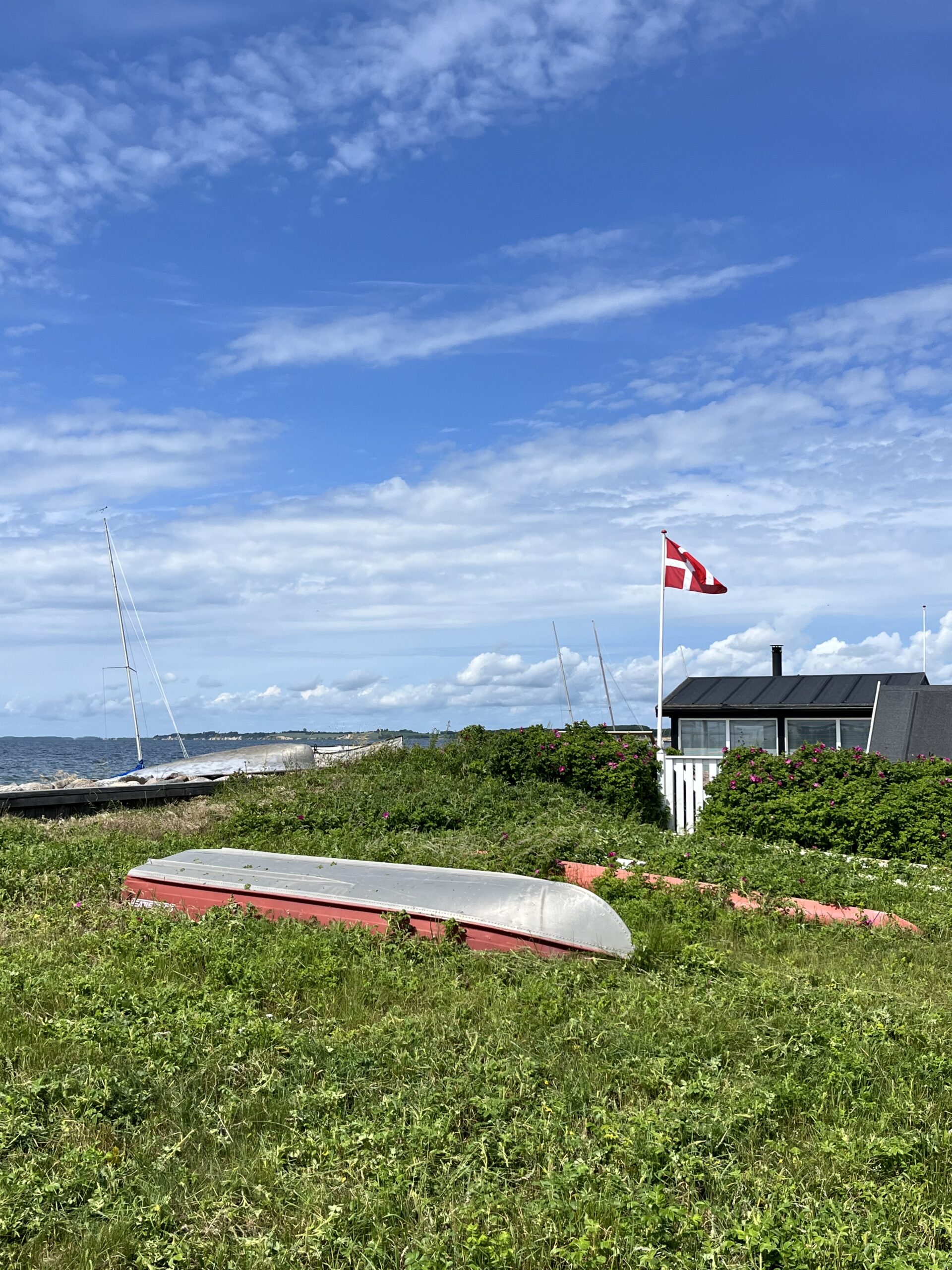 Vi gik ad stien, der følger vandet og fører én ud mod Enøoverdrev. På den ene side havde vi den fineste sandstrand og udsigt over Smålandsfarvandet. Vi kunne se til Knudshoved Odde, som jeg tidligere har skrevet om – på den anden side små, charmerende sommerhuse med fine haver. Der var mange bitte små sommerhuset på bitte små grunde.