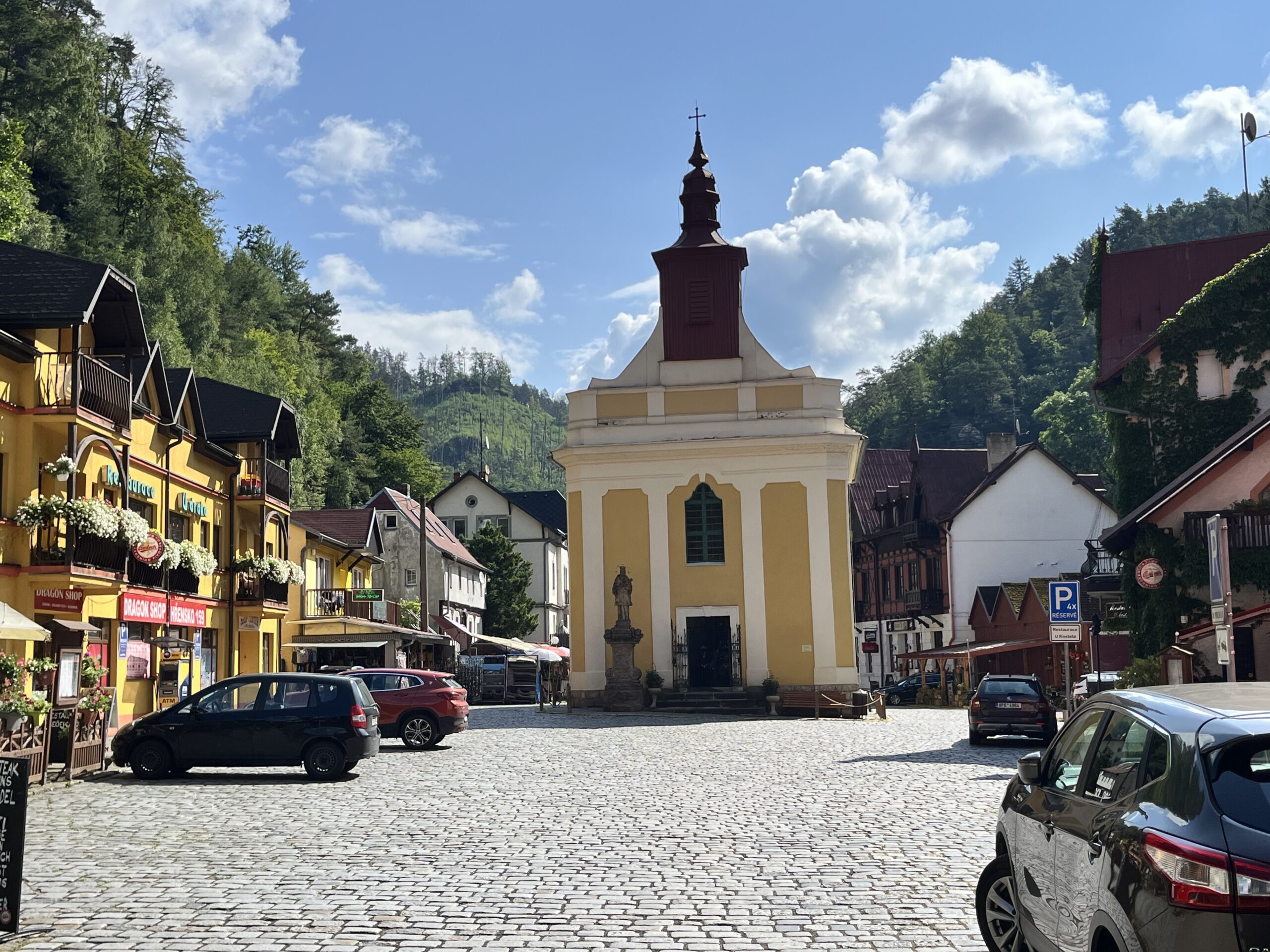 Efter morgenmad på terrassen kørte vi mod Hřensko med en plan om at tage en sejltur på floden Kamenice – en klassisk oplevelse i området. Vi fandt en heldagsparkeringsplads (hvilket senere viste sig at være en ret god idé), og gik derefter forbi turistinformationen. Her blev vi desværre mødt med nyheden om, at der ikke var flere billetter til netop den bådtur, vi havde set frem til.