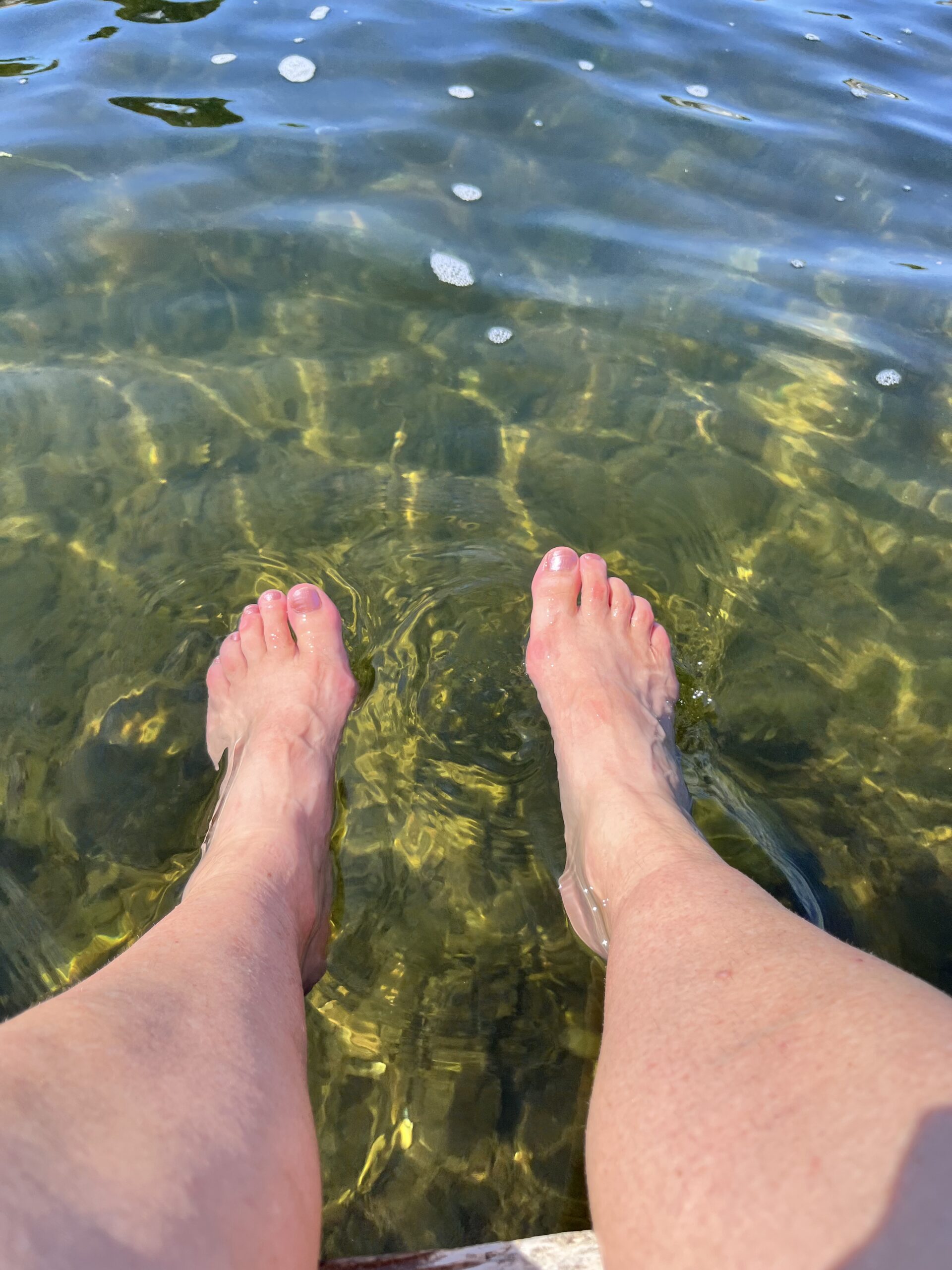 Vores varme fødder får et velfortjent hvil i det klare havvand, og vi læner os tilbage med udsigt til joller, tang og den åbne Østersø.