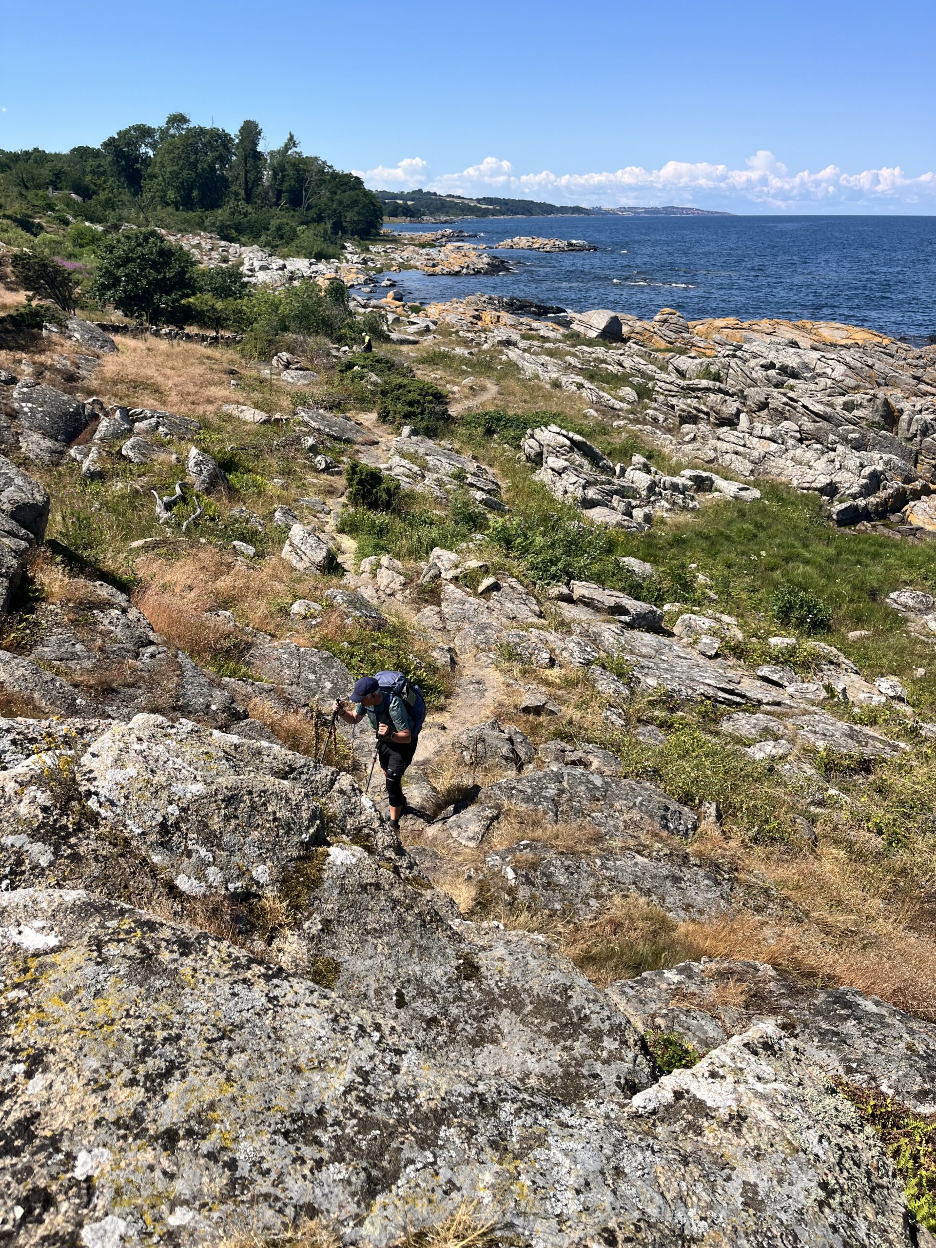 Her er færre stigninger end nordpå, men landskabet veksler smukt mellem små skovstykker, åbne enge og hyggelige kystbyer og klippe kyst. Vi går mest ad trampestier tæt på vandet. Vi kommer enkelte steder lidt på afveje, ruten er ikke lige godt afmærket alle steder.