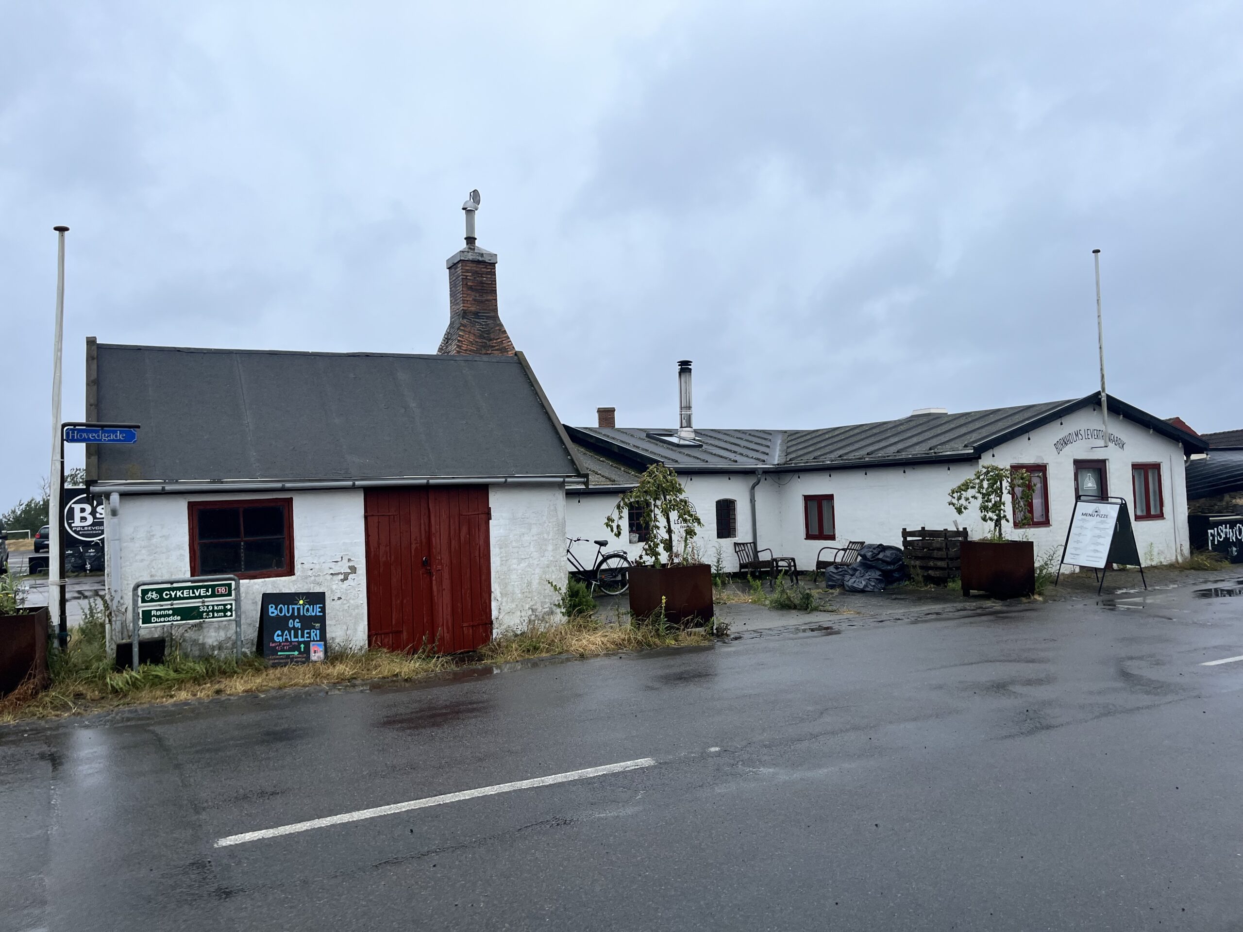I Snogebæk gør vi pause på det hyggelige røgeri. Jeg bestiller friskstegte fiskefrikadeller – varme, sprøde og virkelig lækre. Lidt dampende mad gør underværker efter timer i regn og blæst.
